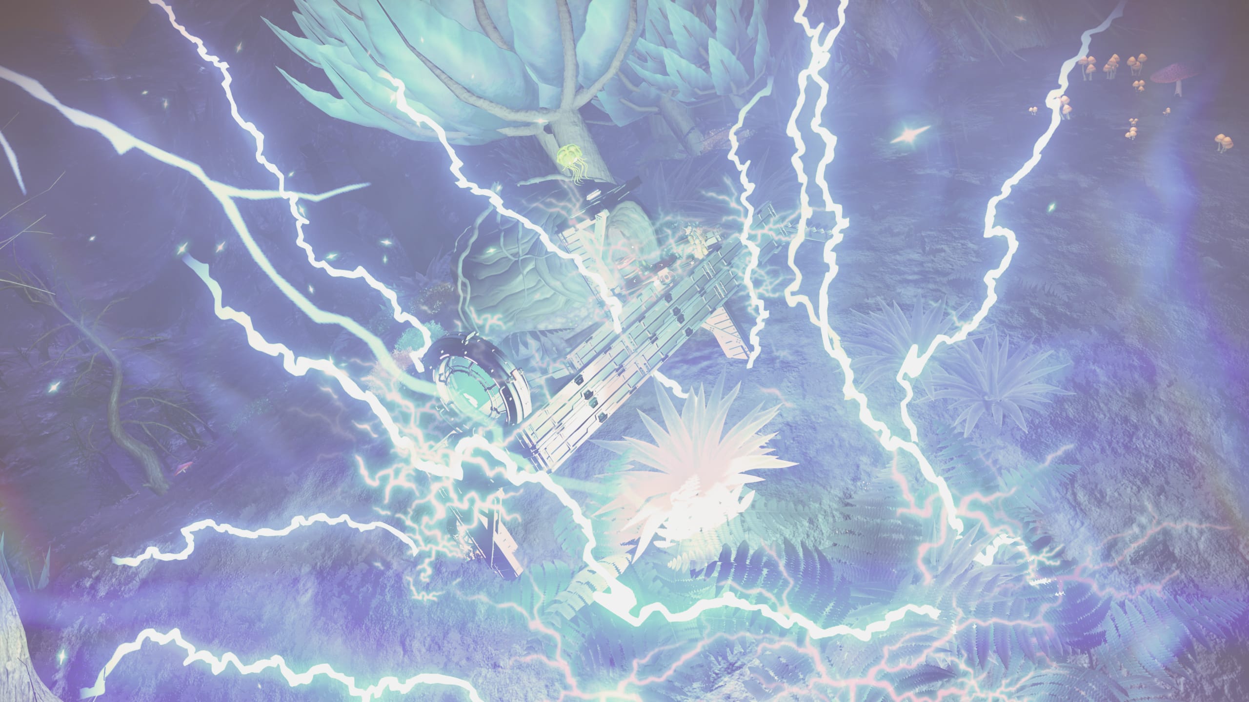 The third and final of these bases is located on a mountainous swamp world with planetary geography on a truly gargantuan scale. The pod I occupied is situated on a hillside with a striking view of the neighboring planet and its small moon floating over the distant hills. For this base, I built out an “attached” front porch to admire the aforementioned view. (“Attaching” any building materials to these huts is a trick of appearance; for the porch, A distance out from the hut I placed a few vertical walls and then approached the hut with floor panels, and when one appeared to be attached to the hut, all previous construction parts were deleted.) Lightning storms are frequent on this world, with electrical anomalies besieging the dwelling violently, as can be seen in the video tour.
