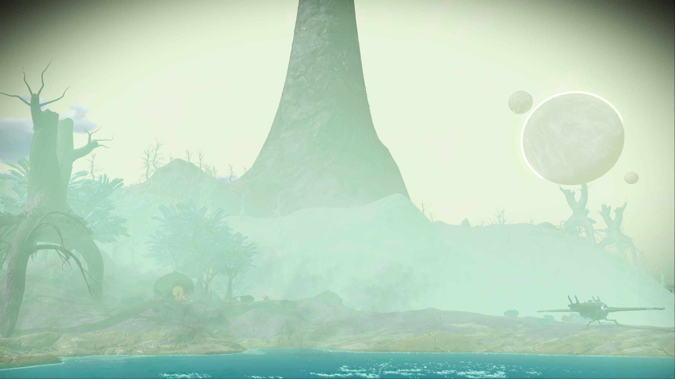 The second of these huts I settled really does feel like a place you might find Yoda hobbling about with his cane. Located on the bank of a swampy lake, the landscape is marked with occasional giant spires rising impossibly high into the sky. The dwelling features a two-story design of sorts, with the bed on a raised platform, within. While the weather is mild, local meteor showers are frequent and getting caught too far from base or ship is something I have found to be unwise.
