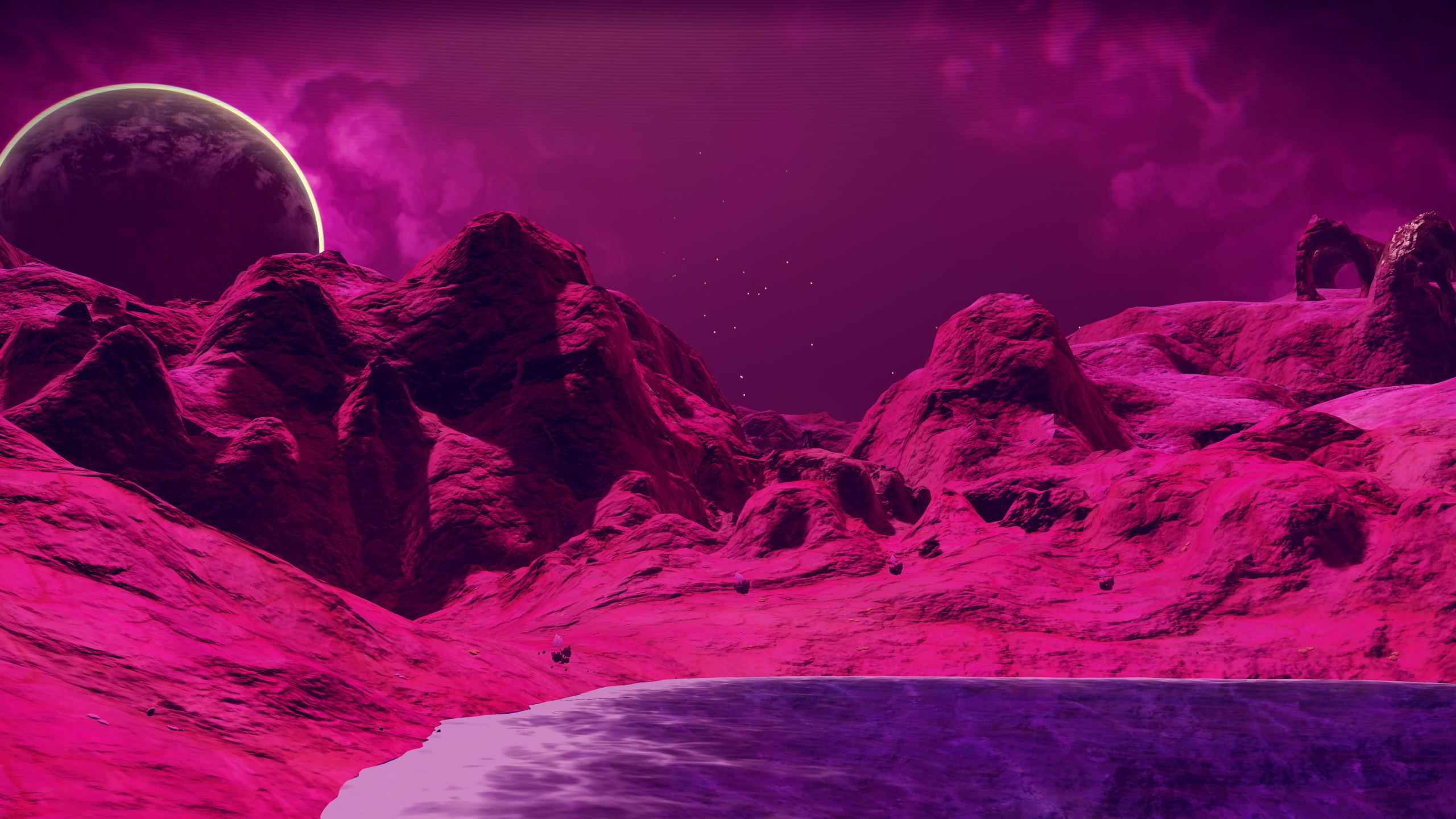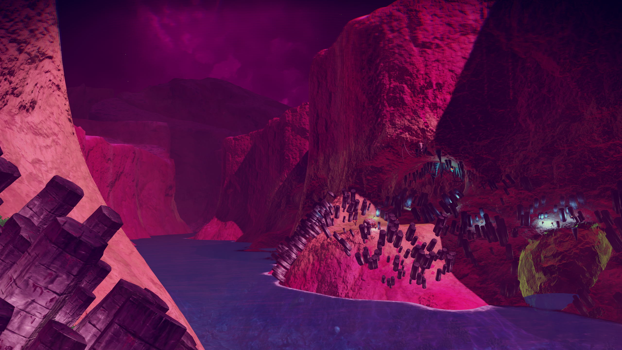 The world is devoid of all flora and fauna and is nearly silent but for a subtle and woeful drone sung by the wind. It is a striking, high-contrast pink-purple world with a dark and purple sky. The landscape is full of rocky crags with stone arches and water lakes here and there. It is rather unlike anything one might encounter in more recent versions of the game.