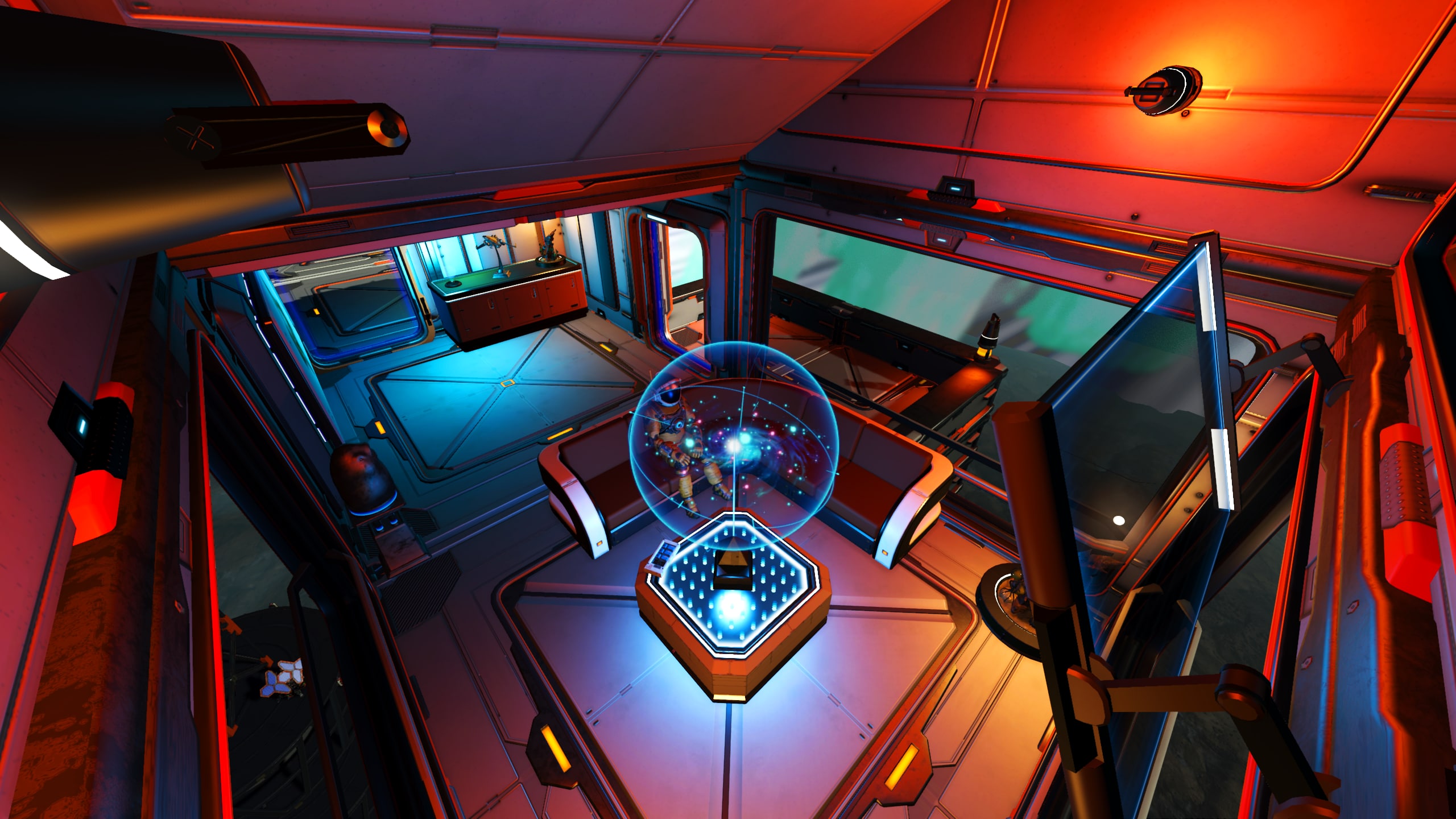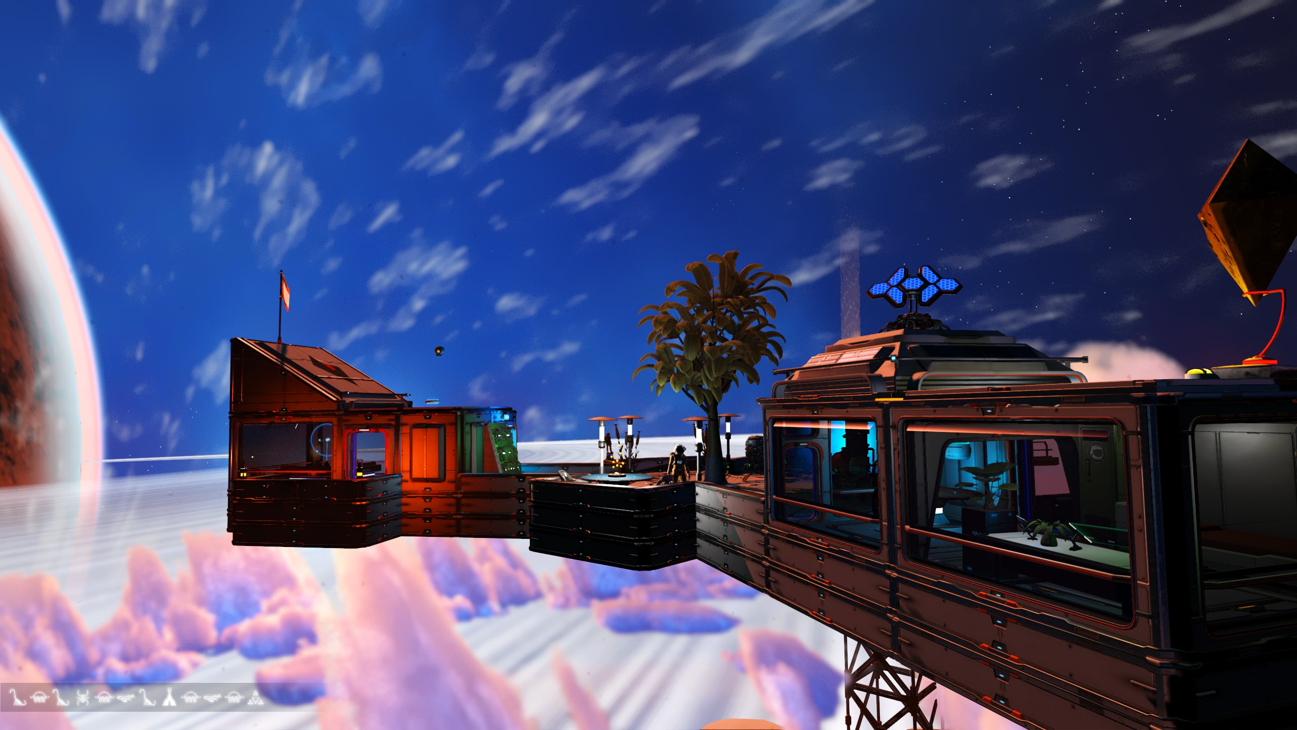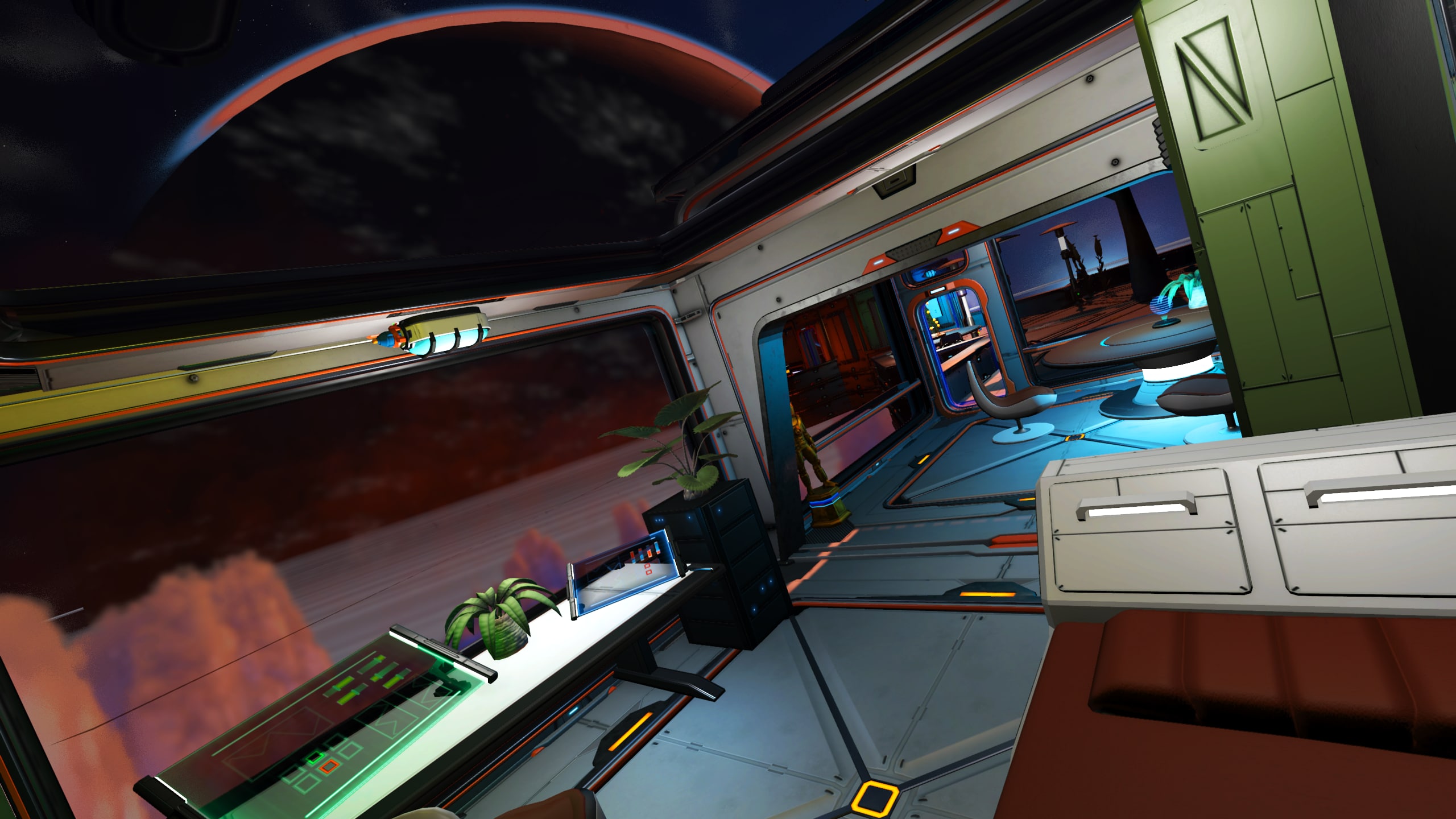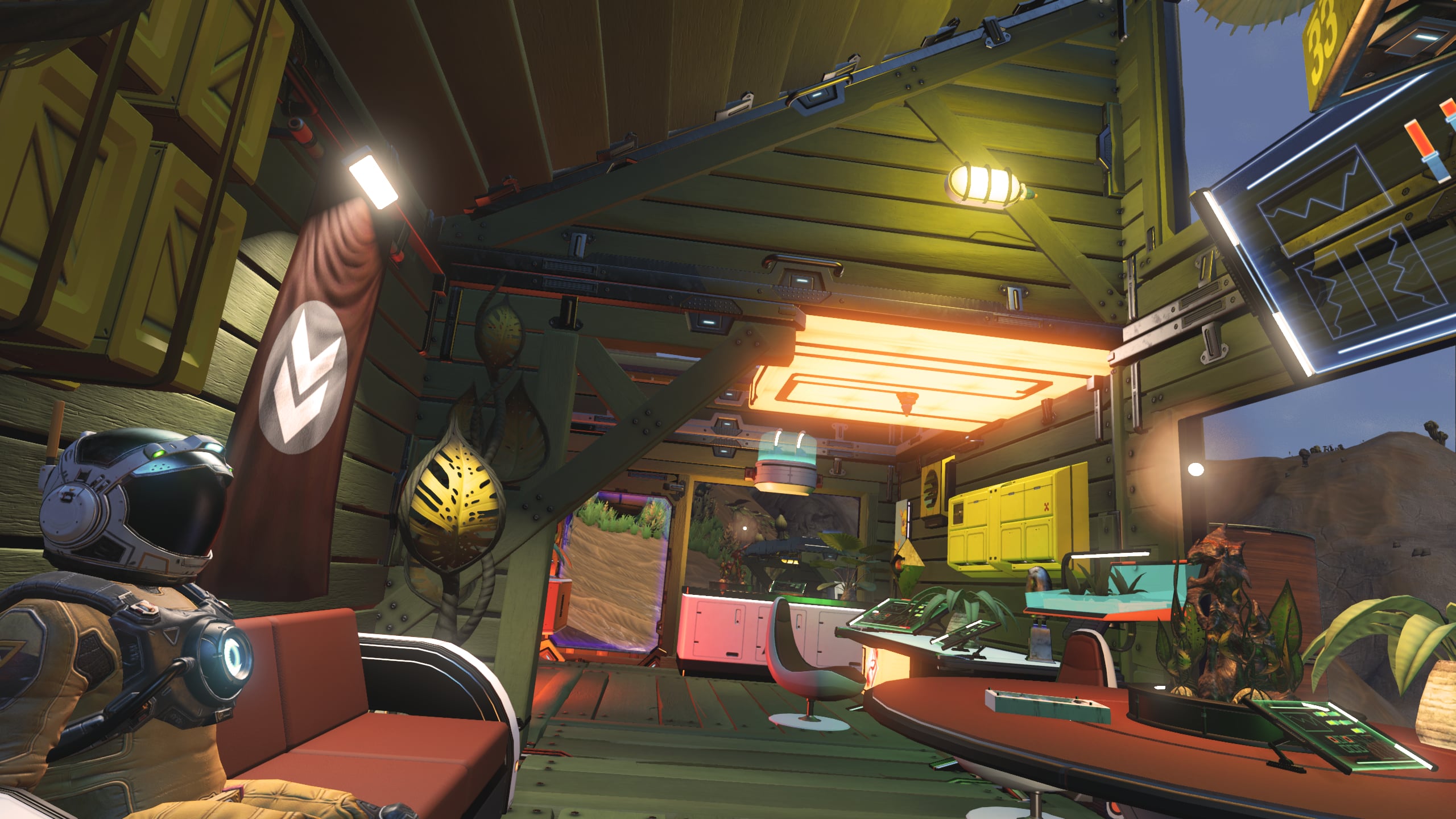 The wood-slatted base is comprised of three rooms, somewhat partitioned by beams and rafters. Entering the dwelling, one finds themself in the computing and communications area. Proceeding further into the base, a living area with a couch, meal table, and large-screen display can be found. Beyond this lies a sleeping area with storage lockers and closets and a doorway leading out onto a platform that leans out over the cliff edge and features a small sitting area as well as a Base Teleport Module. The entire dwelling is generously arrayed with flora of various sorts, in the interest of augmenting the oxygen levels of the world’s thin atmosphere.