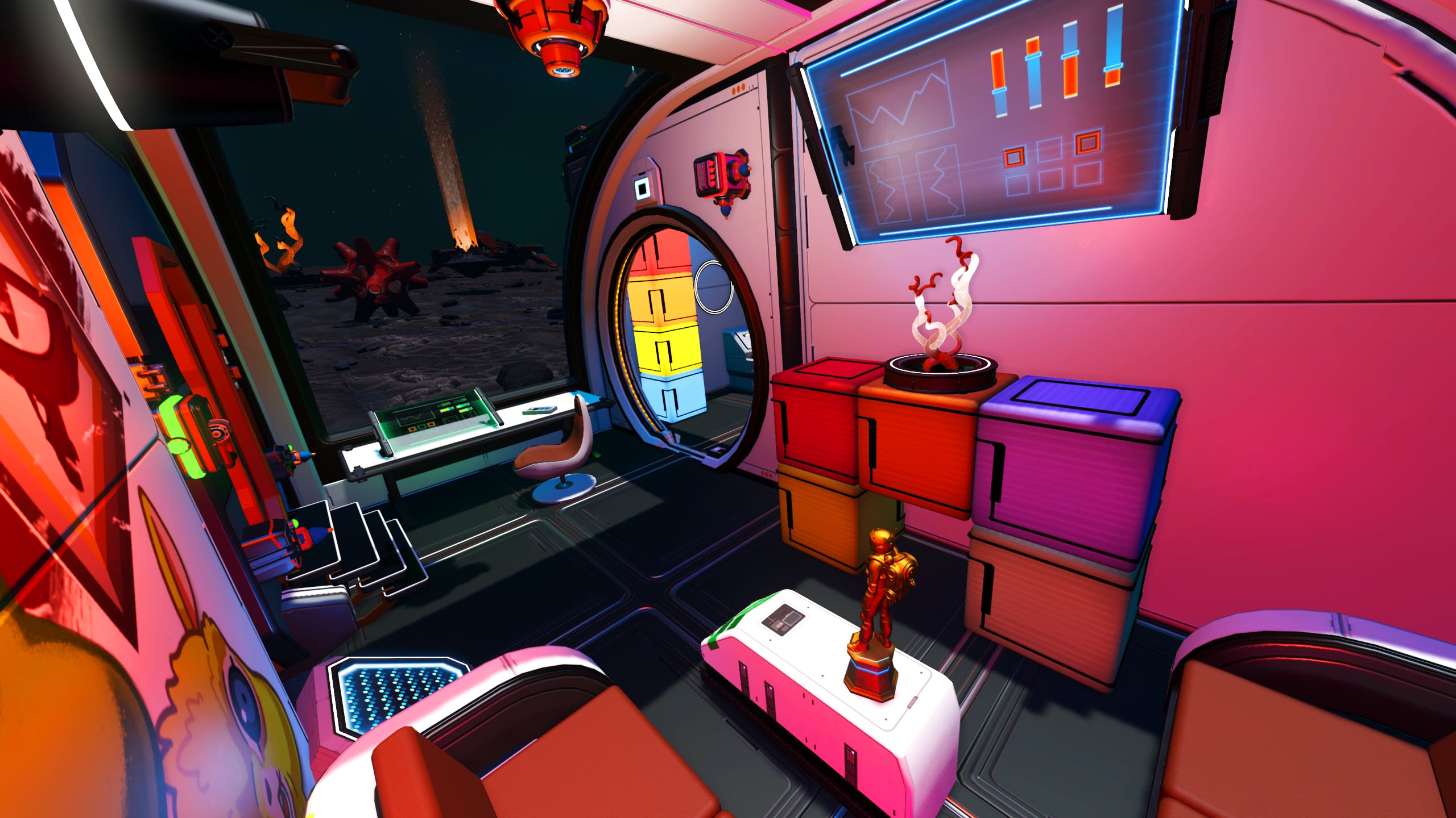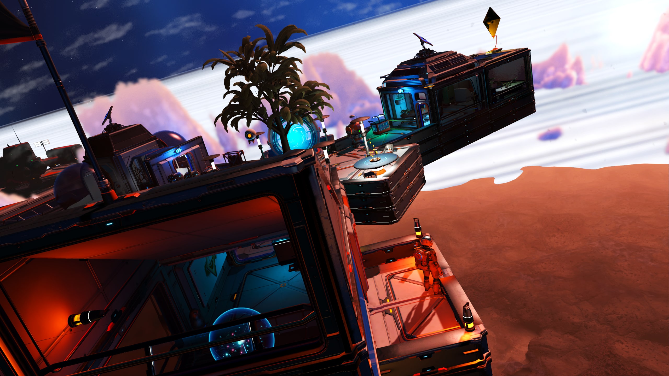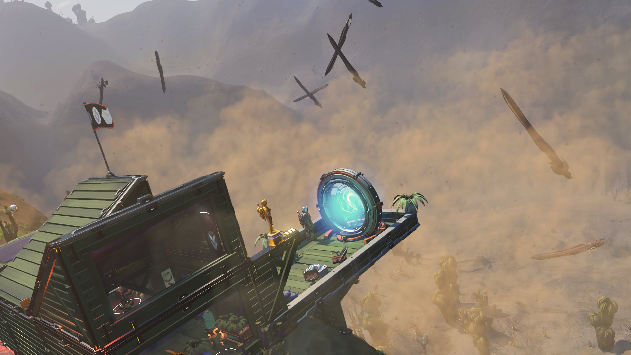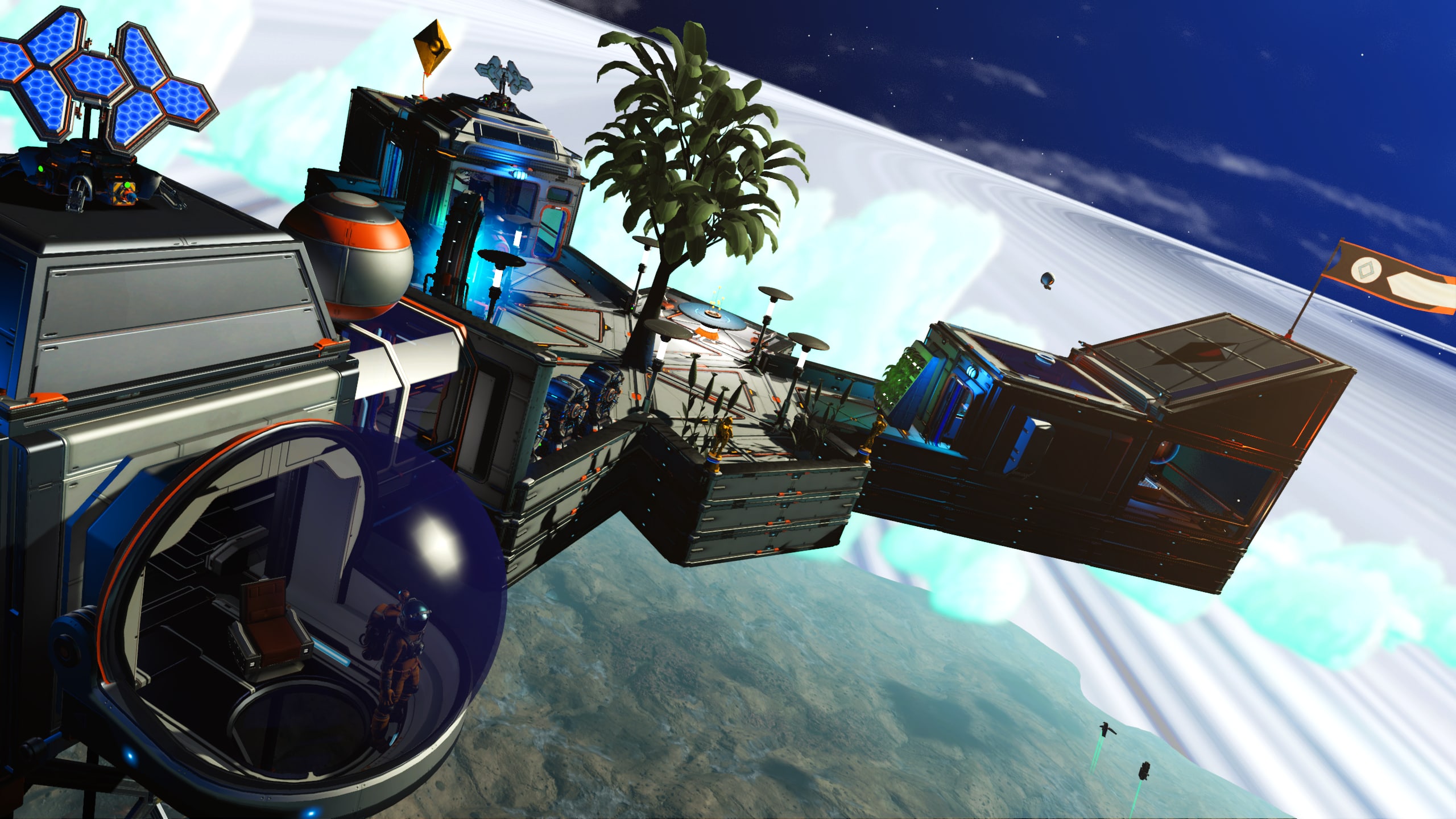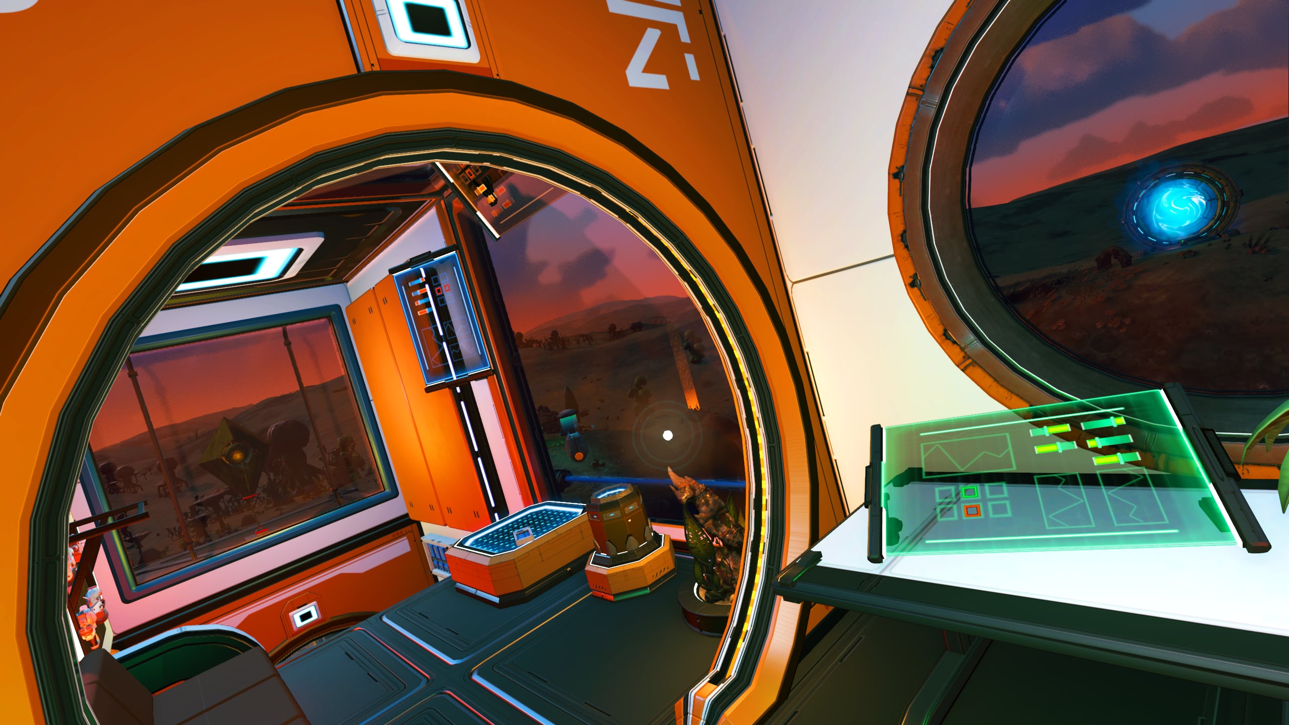 The wood-slatted base is comprised of three rooms, somewhat partitioned by beams and rafters. Entering the dwelling, one finds themself in the computing and communications area. Proceeding further into the base, a living area with a couch, meal table, and large-screen display can be found. Beyond this lies a sleeping area with storage lockers and closets and a doorway leading out onto a platform that leans out over the cliff edge and features a small sitting area as well as a Base Teleport Module. The entire dwelling is generously arrayed with flora of various sorts, in the interest of augmenting the oxygen levels of the world’s thin atmosphere.