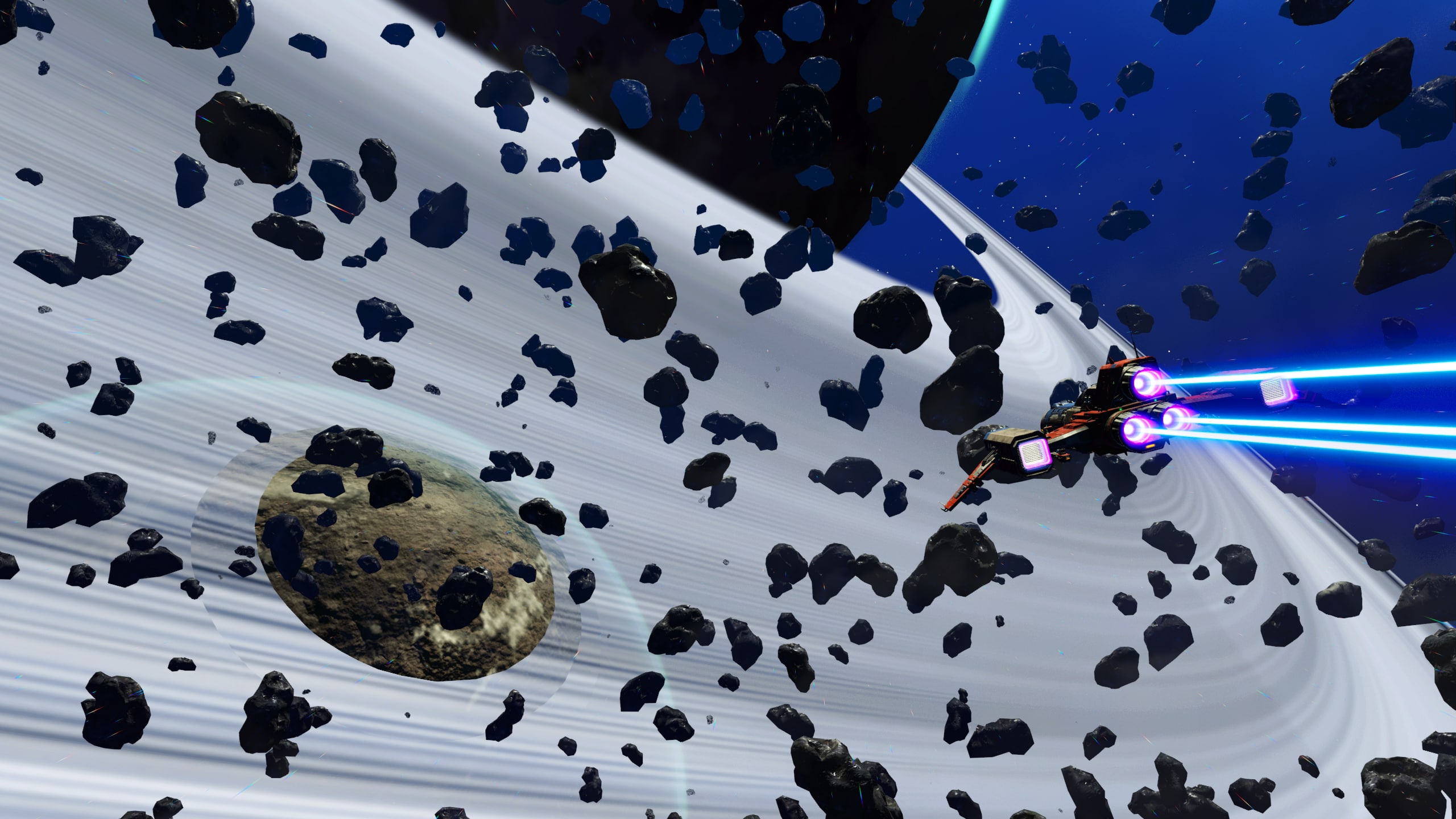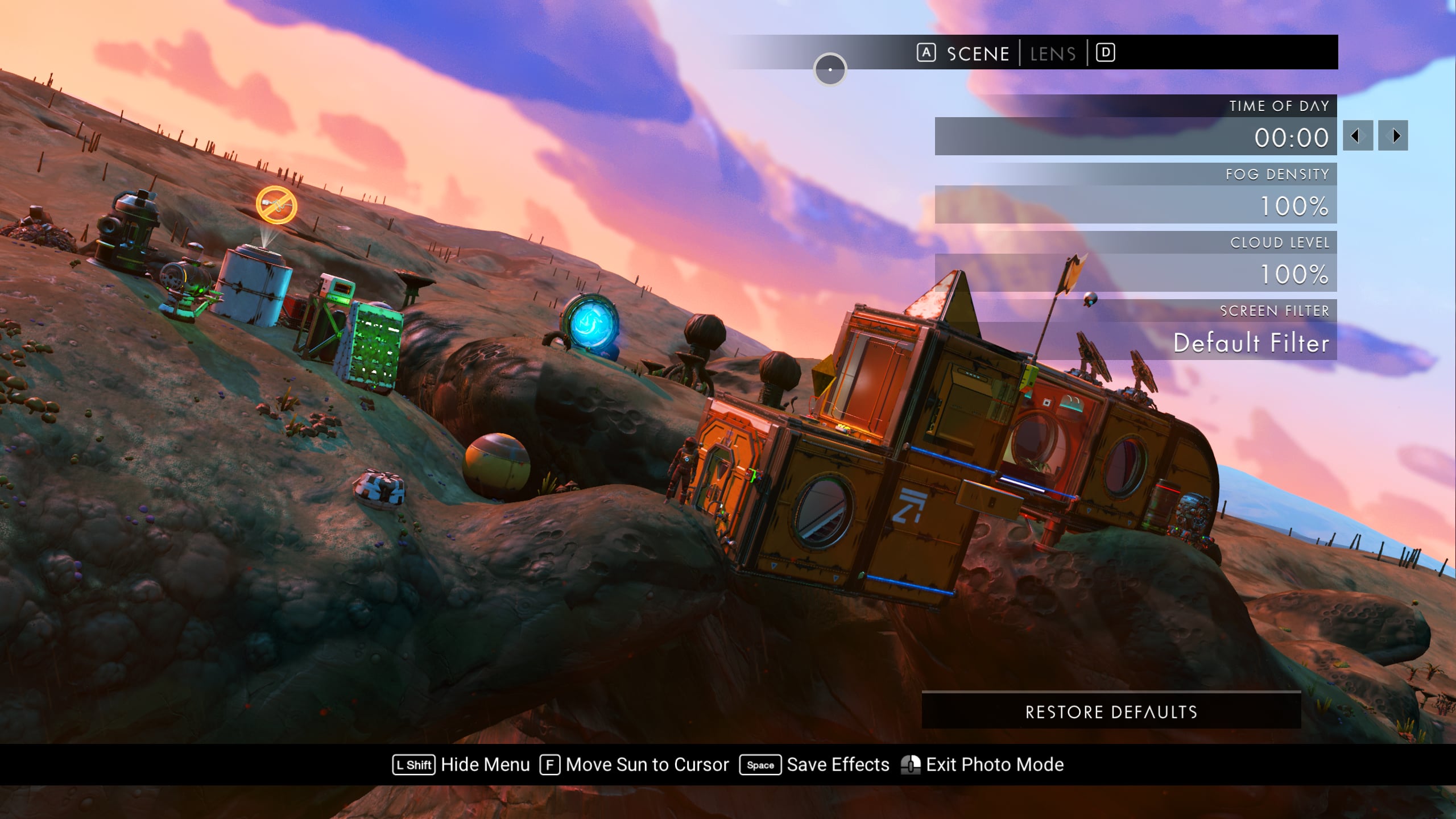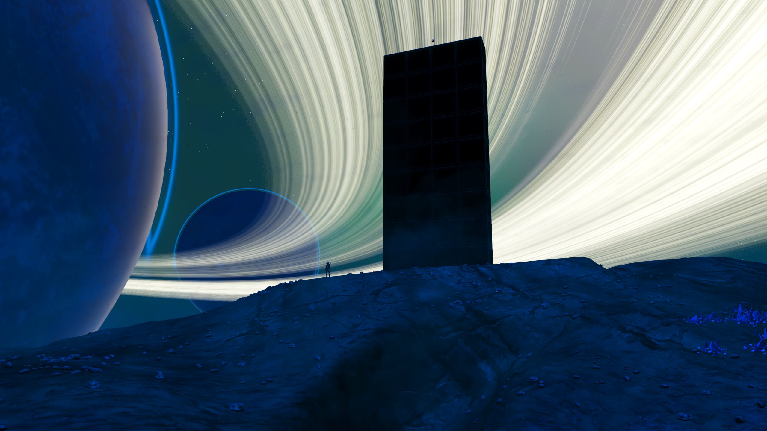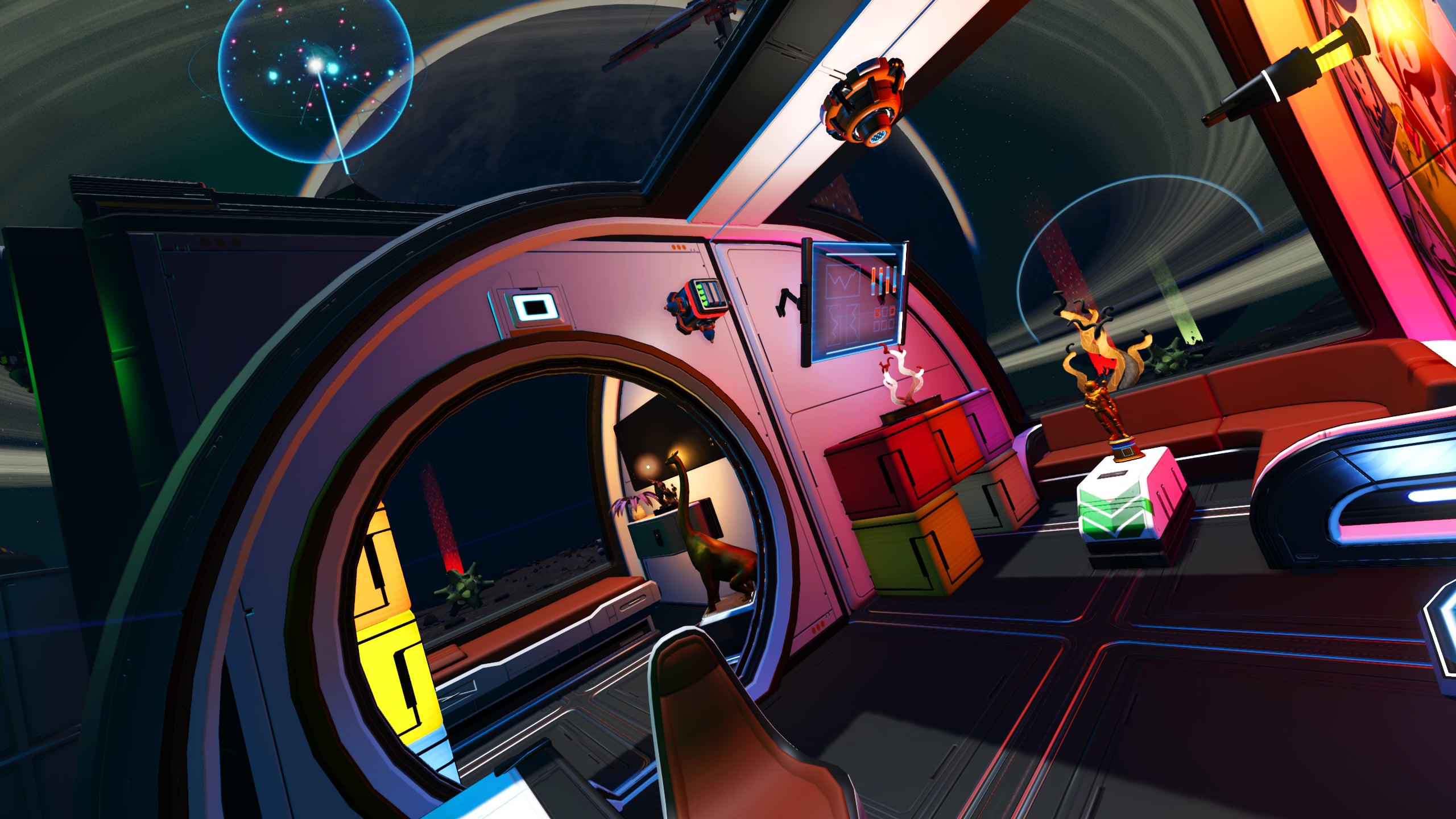 The wood-slatted base is comprised of three rooms, somewhat partitioned by beams and rafters. Entering the dwelling, one finds themself in the computing and communications area. Proceeding further into the base, a living area with a couch, meal table, and large-screen display can be found. Beyond this lies a sleeping area with storage lockers and closets and a doorway leading out onto a platform that leans out over the cliff edge and features a small sitting area as well as a Base Teleport Module. The entire dwelling is generously arrayed with flora of various sorts, in the interest of augmenting the oxygen levels of the world’s thin atmosphere.