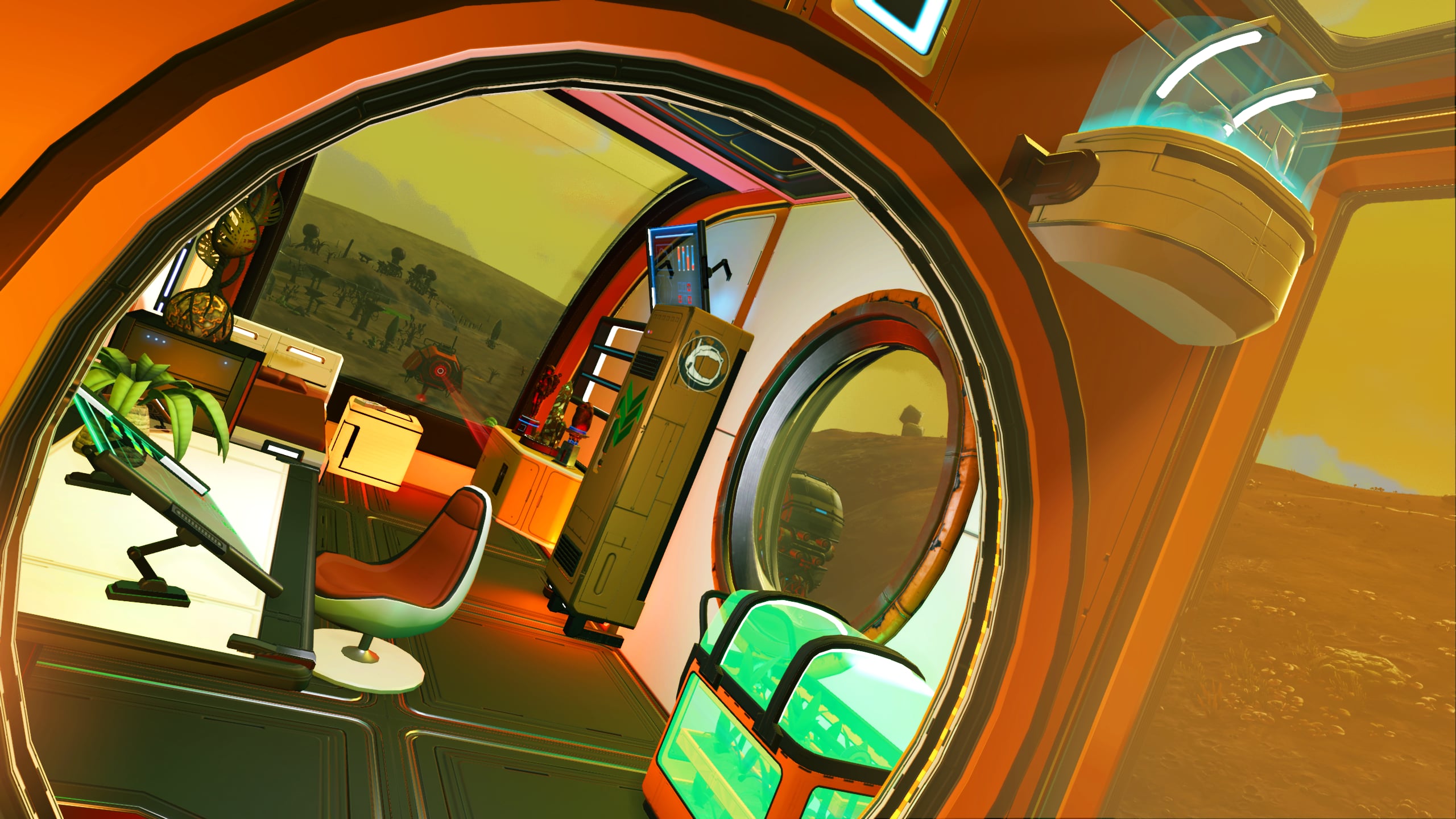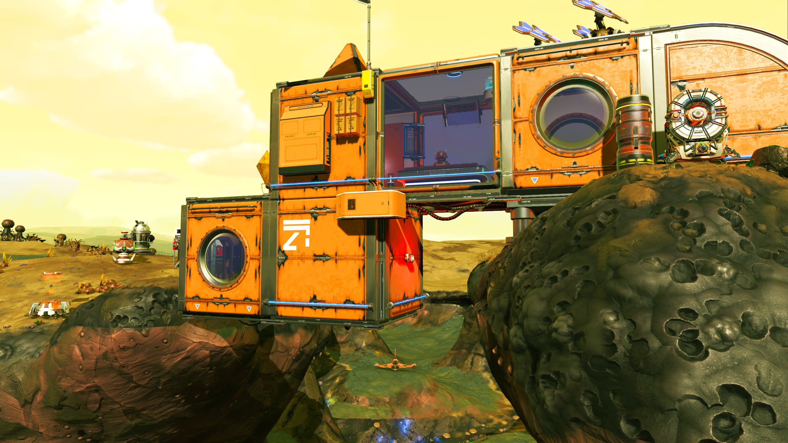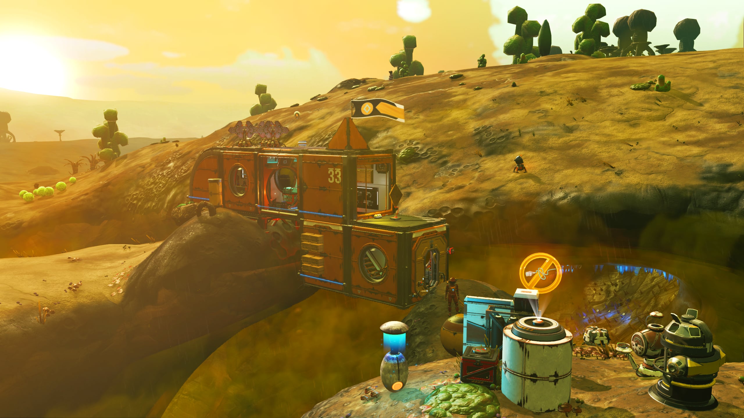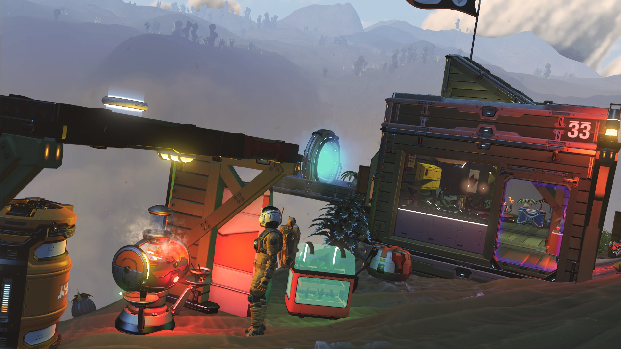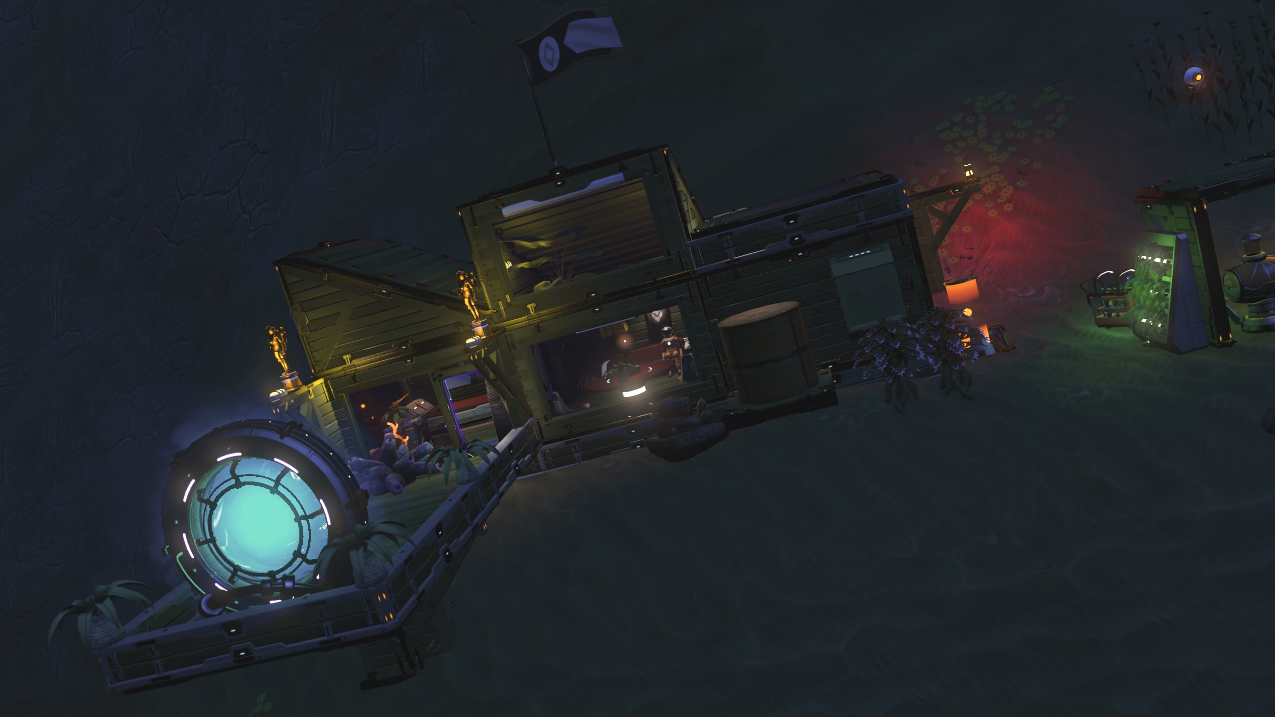 In the interest of space savings, the Nutrient Processor and various additional storage tanks and containers are located out of doors, but in close proximity to the base. A small patch of Curious Corn has been planted along the cliff to provide additional foodstocks.