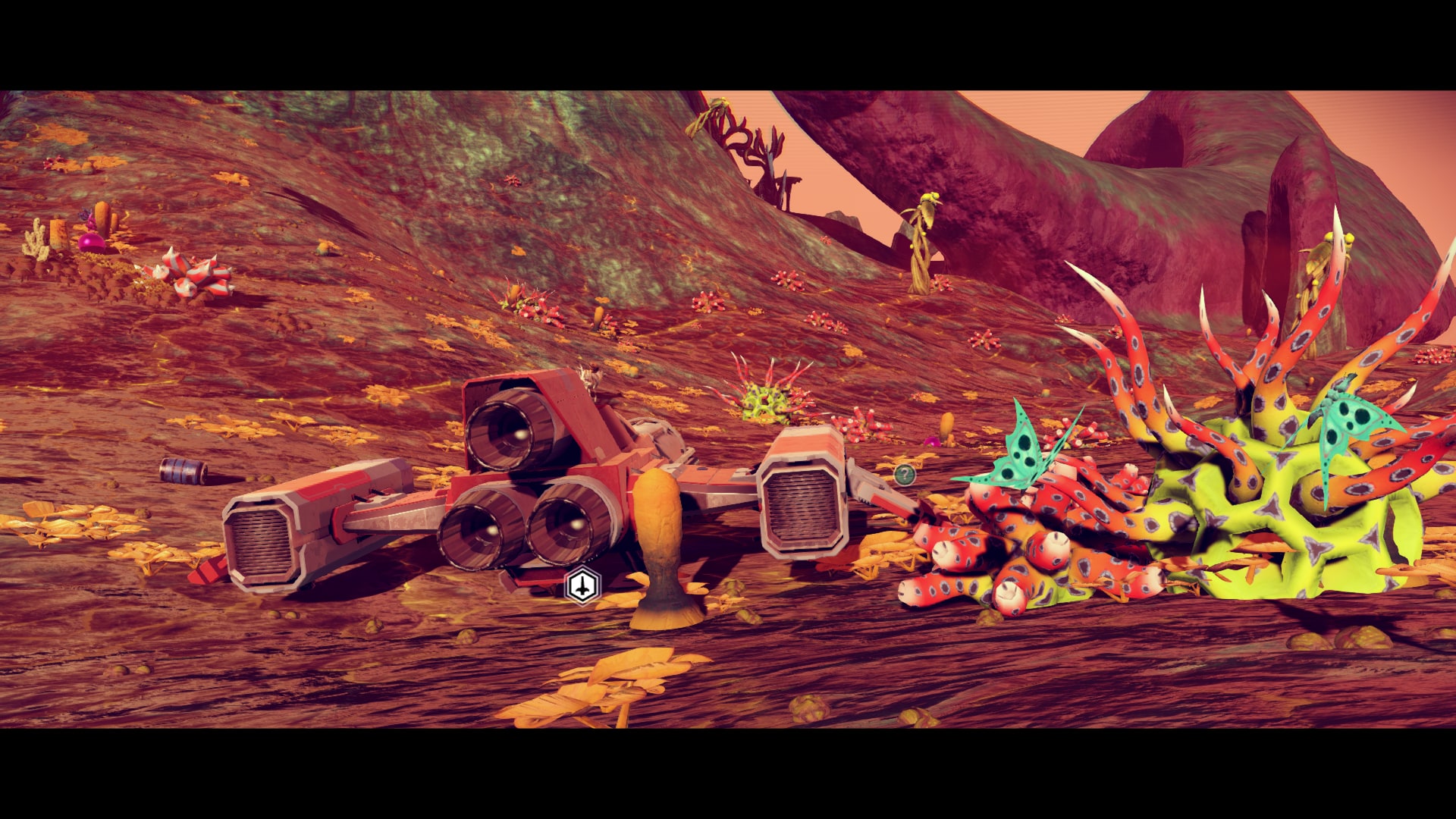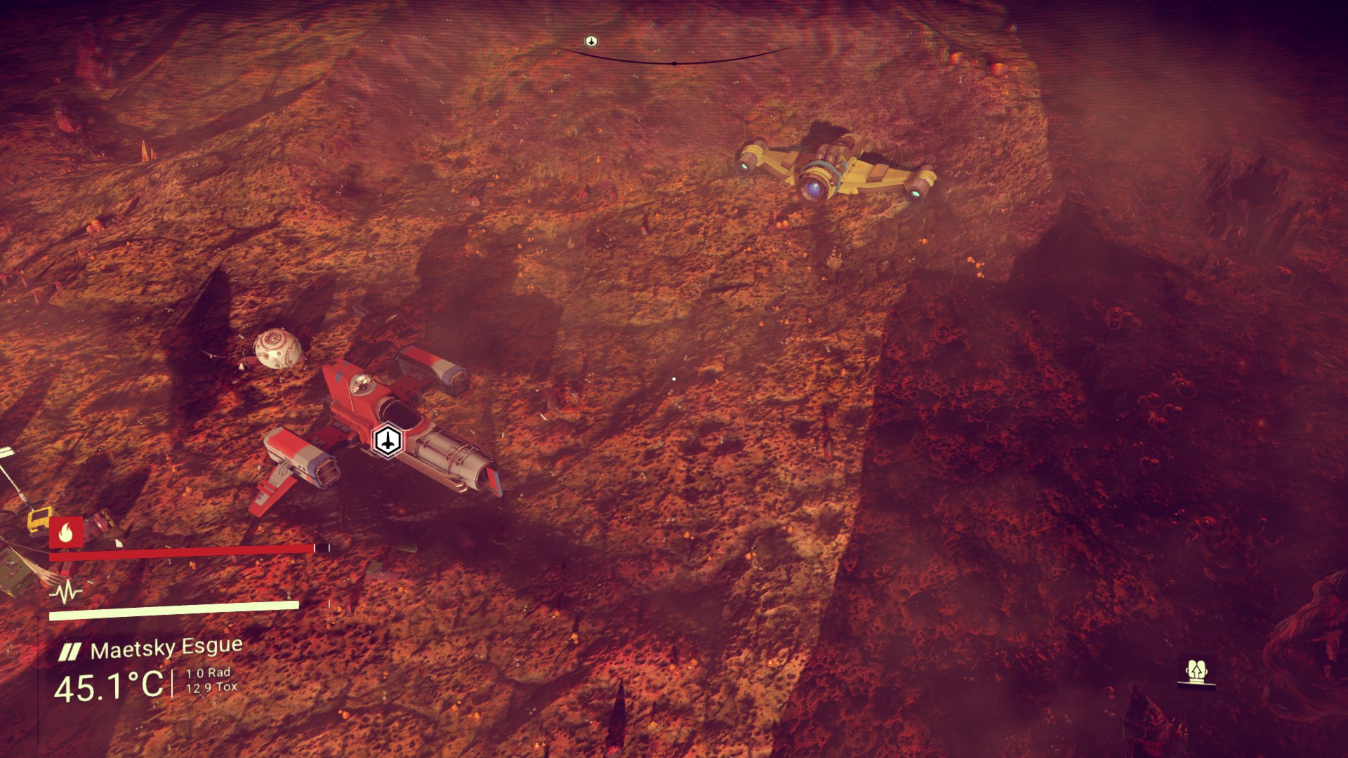 While these Habitable Bases could be found spread across every world in the game, they could be hard to find. The quickest way to find one was to deploy a Signal Booster and, with some Navigation Data in your inventory, scan for a Habitable Base. This would identify a base on the HUD, which you could travel to and claim. (A short video from the time of Foundation‘s release illustrates the process.) Some players, myself included, wanted to find a base with a nice view, so would instead fly above the surface, visually searching for a base in a particularly nice spot — you could only have one base at a time, after all. This could take quite a while. I recall typically spending about five to ten minutes flying around before finding a base, though sometimes it took much longer, and it took some real searching to find that perfect, scenic location — hours usually.